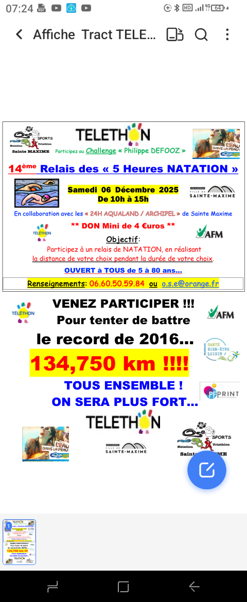 Le club de Tri de St Maxime vous propose de participer au 5 heures de natation au profit du Telethon.